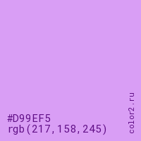 Цвет #D99EF5 в цветовой модели RGB обозначается тремя октетами (217, 158, 245) в десятичном формате и #D99EF5 в шестнадцатиричном (hex) формате, которые являются интенсивностью красного 217 (hex D9), интенсивность зелёного 158 (hex 9E) и интенсивность синего 245 (hex F5).