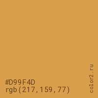 Цвет #D99F4D в цветовой модели RGB обозначается тремя октетами (217, 159, 77) в десятичном формате и #D99F4D в шестнадцатиричном (hex) формате, которые являются интенсивностью красного 217 (hex D9), интенсивность зелёного 159 (hex 9F) и интенсивность синего 77 (hex 4D).