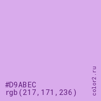 Цвет #D9ABEC в цветовой модели RGB обозначается тремя октетами (217, 171, 236) в десятичном формате и #D9ABEC в шестнадцатиричном (hex) формате, которые являются интенсивностью красного 217 (hex D9), интенсивность зелёного 171 (hex AB) и интенсивность синего 236 (hex EC).
