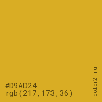 Цвет #D9AD24 в цветовой модели RGB обозначается тремя октетами (217, 173, 36) в десятичном формате и #D9AD24 в шестнадцатиричном (hex) формате, которые являются интенсивностью красного 217 (hex D9), интенсивность зелёного 173 (hex AD) и интенсивность синего 36 (hex 24).