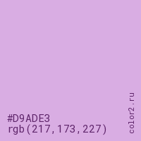 Цвет #D9ADE3 в цветовой модели RGB обозначается тремя октетами (217, 173, 227) в десятичном формате и #D9ADE3 в шестнадцатиричном (hex) формате, которые являются интенсивностью красного 217 (hex D9), интенсивность зелёного 173 (hex AD) и интенсивность синего 227 (hex E3).