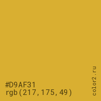 Цвет #D9AF31 в цветовой модели RGB обозначается тремя октетами (217, 175, 49) в десятичном формате и #D9AF31 в шестнадцатиричном (hex) формате, которые являются интенсивностью красного 217 (hex D9), интенсивность зелёного 175 (hex AF) и интенсивность синего 49 (hex 31).