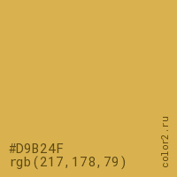 Цвет #D9B24F в цветовой модели RGB обозначается тремя октетами (217, 178, 79) в десятичном формате и #D9B24F в шестнадцатиричном (hex) формате, которые являются интенсивностью красного 217 (hex D9), интенсивность зелёного 178 (hex B2) и интенсивность синего 79 (hex 4F).