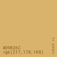 Цвет #D9B26C в цветовой модели RGB обозначается тремя октетами (217, 178, 108) в десятичном формате и #D9B26C в шестнадцатиричном (hex) формате, которые являются интенсивностью красного 217 (hex D9), интенсивность зелёного 178 (hex B2) и интенсивность синего 108 (hex 6C).