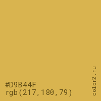 Цвет #D9B44F в цветовой модели RGB обозначается тремя октетами (217, 180, 79) в десятичном формате и #D9B44F в шестнадцатиричном (hex) формате, которые являются интенсивностью красного 217 (hex D9), интенсивность зелёного 180 (hex B4) и интенсивность синего 79 (hex 4F).