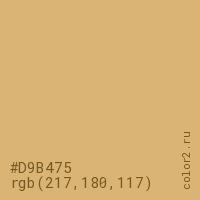Цвет #D9B475 в цветовой модели RGB обозначается тремя октетами (217, 180, 117) в десятичном формате и #D9B475 в шестнадцатиричном (hex) формате, которые являются интенсивностью красного 217 (hex D9), интенсивность зелёного 180 (hex B4) и интенсивность синего 117 (hex 75).