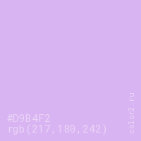 Цвет #D9B4F2 в цветовой модели RGB обозначается тремя октетами (217, 180, 242) в десятичном формате и #D9B4F2 в шестнадцатиричном (hex) формате, которые являются интенсивностью красного 217 (hex D9), интенсивность зелёного 180 (hex B4) и интенсивность синего 242 (hex F2).
