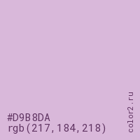 Цвет #D9B8DA в цветовой модели RGB обозначается тремя октетами (217, 184, 218) в десятичном формате и #D9B8DA в шестнадцатиричном (hex) формате, которые являются интенсивностью красного 217 (hex D9), интенсивность зелёного 184 (hex B8) и интенсивность синего 218 (hex DA).