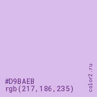 Цвет RGB(217, 186, 235) в процентом отношении количества цвета состоит из 85.1% красного (red), 72.9% зелёного (green) и 92.2% синего (blue).