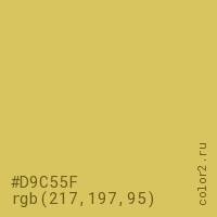 Цвет #D9C55F в цветовой модели RGB обозначается тремя октетами (217, 197, 95) в десятичном формате и #D9C55F в шестнадцатиричном (hex) формате, которые являются интенсивностью красного 217 (hex D9), интенсивность зелёного 197 (hex C5) и интенсивность синего 95 (hex 5F).