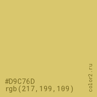 Цвет #D9C76D в цветовой модели RGB обозначается тремя октетами (217, 199, 109) в десятичном формате и #D9C76D в шестнадцатиричном (hex) формате, которые являются интенсивностью красного 217 (hex D9), интенсивность зелёного 199 (hex C7) и интенсивность синего 109 (hex 6D).