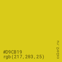 Цвет #D9CB19 в цветовой модели RGB обозначается тремя октетами (217, 203, 25) в десятичном формате и #D9CB19 в шестнадцатиричном (hex) формате, которые являются интенсивностью красного 217 (hex D9), интенсивность зелёного 203 (hex CB) и интенсивность синего 25 (hex 19).