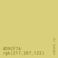 Цвет #D9CF7A в цветовой модели RGB обозначается тремя октетами (217, 207, 122) в десятичном формате и #D9CF7A в шестнадцатиричном (hex) формате, которые являются интенсивностью красного 217 (hex D9), интенсивность зелёного 207 (hex CF) и интенсивность синего 122 (hex 7A).