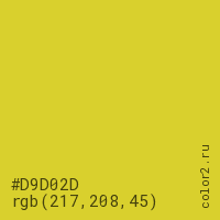 Цвет #D9D02D в цветовой модели RGB обозначается тремя октетами (217, 208, 45) в десятичном формате и #D9D02D в шестнадцатиричном (hex) формате, которые являются интенсивностью красного 217 (hex D9), интенсивность зелёного 208 (hex D0) и интенсивность синего 45 (hex 2D).