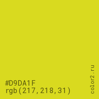 Цвет #D9DA1F в цветовой модели RGB обозначается тремя октетами (217, 218, 31) в десятичном формате и #D9DA1F в шестнадцатиричном (hex) формате, которые являются интенсивностью красного 217 (hex D9), интенсивность зелёного 218 (hex DA) и интенсивность синего 31 (hex 1F).