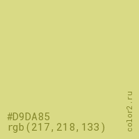 Цвет #D9DA85 в цветовой модели RGB обозначается тремя октетами (217, 218, 133) в десятичном формате и #D9DA85 в шестнадцатиричном (hex) формате, которые являются интенсивностью красного 217 (hex D9), интенсивность зелёного 218 (hex DA) и интенсивность синего 133 (hex 85).