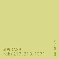 Цвет #D9DA89 в цветовой модели RGB обозначается тремя октетами (217, 218, 137) в десятичном формате и #D9DA89 в шестнадцатиричном (hex) формате, которые являются интенсивностью красного 217 (hex D9), интенсивность зелёного 218 (hex DA) и интенсивность синего 137 (hex 89).