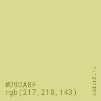 Цвет #D9DA8F в цветовой модели RGB обозначается тремя октетами (217, 218, 143) в десятичном формате и #D9DA8F в шестнадцатиричном (hex) формате, которые являются интенсивностью красного 217 (hex D9), интенсивность зелёного 218 (hex DA) и интенсивность синего 143 (hex 8F).
