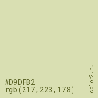 Цвет #D9DFB2 в цветовой модели RGB обозначается тремя октетами (217, 223, 178) в десятичном формате и #D9DFB2 в шестнадцатиричном (hex) формате, которые являются интенсивностью красного 217 (hex D9), интенсивность зелёного 223 (hex DF) и интенсивность синего 178 (hex B2).