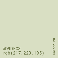 Цвет #D9DFC3 в цветовой модели RGB обозначается тремя октетами (217, 223, 195) в десятичном формате и #D9DFC3 в шестнадцатиричном (hex) формате, которые являются интенсивностью красного 217 (hex D9), интенсивность зелёного 223 (hex DF) и интенсивность синего 195 (hex C3).