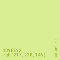 Цвет #D9EE92 в цветовой модели RGB обозначается тремя октетами (217, 238, 146) в десятичном формате и #D9EE92 в шестнадцатиричном (hex) формате, которые являются интенсивностью красного 217 (hex D9), интенсивность зелёного 238 (hex EE) и интенсивность синего 146 (hex 92).