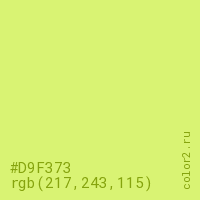 Цвет #D9F373 в цветовой модели RGB обозначается тремя октетами (217, 243, 115) в десятичном формате и #D9F373 в шестнадцатиричном (hex) формате, которые являются интенсивностью красного 217 (hex D9), интенсивность зелёного 243 (hex F3) и интенсивность синего 115 (hex 73).