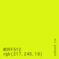 Цвет #D9F512 в цветовой модели RGB обозначается тремя октетами (217, 245, 18) в десятичном формате и #D9F512 в шестнадцатиричном (hex) формате, которые являются интенсивностью красного 217 (hex D9), интенсивность зелёного 245 (hex F5) и интенсивность синего 18 (hex 12).