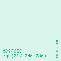 Цвет #D9F6EC в цветовой модели RGB обозначается тремя октетами (217, 246, 236) в десятичном формате и #D9F6EC в шестнадцатиричном (hex) формате, которые являются интенсивностью красного 217 (hex D9), интенсивность зелёного 246 (hex F6) и интенсивность синего 236 (hex EC).
