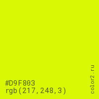 Цвет #D9F803 в цветовой модели RGB обозначается тремя октетами (217, 248, 3) в десятичном формате и #D9F803 в шестнадцатиричном (hex) формате, которые являются интенсивностью красного 217 (hex D9), интенсивность зелёного 248 (hex F8) и интенсивность синего 3 (hex 03).