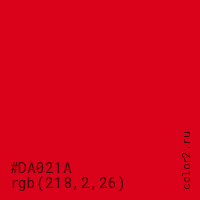 Цвет #DA021A в цветовой модели RGB обозначается тремя октетами (218, 2, 26) в десятичном формате и #DA021A в шестнадцатиричном (hex) формате, которые являются интенсивностью красного 218 (hex DA), интенсивность зелёного 2 (hex 02) и интенсивность синего 26 (hex 1A).