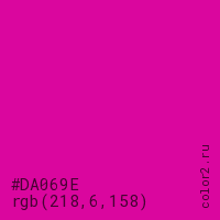Цвет #DA069E в цветовой модели RGB обозначается тремя октетами (218, 6, 158) в десятичном формате и #DA069E в шестнадцатиричном (hex) формате, которые являются интенсивностью красного 218 (hex DA), интенсивность зелёного 6 (hex 06) и интенсивность синего 158 (hex 9E).