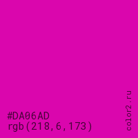Цвет #DA06AD в цветовой модели RGB обозначается тремя октетами (218, 6, 173) в десятичном формате и #DA06AD в шестнадцатиричном (hex) формате, которые являются интенсивностью красного 218 (hex DA), интенсивность зелёного 6 (hex 06) и интенсивность синего 173 (hex AD).