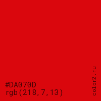 Цвет #DA070D в цветовой модели RGB обозначается тремя октетами (218, 7, 13) в десятичном формате и #DA070D в шестнадцатиричном (hex) формате, которые являются интенсивностью красного 218 (hex DA), интенсивность зелёного 7 (hex 07) и интенсивность синего 13 (hex 0D).