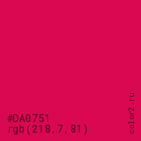 Цвет #DA0751 в цветовой модели RGB обозначается тремя октетами (218, 7, 81) в десятичном формате и #DA0751 в шестнадцатиричном (hex) формате, которые являются интенсивностью красного 218 (hex DA), интенсивность зелёного 7 (hex 07) и интенсивность синего 81 (hex 51).