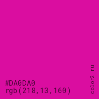 Цвет #DA0DA0 в цветовой модели RGB обозначается тремя октетами (218, 13, 160) в десятичном формате и #DA0DA0 в шестнадцатиричном (hex) формате, которые являются интенсивностью красного 218 (hex DA), интенсивность зелёного 13 (hex 0D) и интенсивность синего 160 (hex A0).