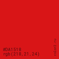Цвет #DA1518 в цветовой модели RGB обозначается тремя октетами (218, 21, 24) в десятичном формате и #DA1518 в шестнадцатиричном (hex) формате, которые являются интенсивностью красного 218 (hex DA), интенсивность зелёного 21 (hex 15) и интенсивность синего 24 (hex 18).