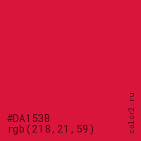 Цвет #DA153B в цветовой модели RGB обозначается тремя октетами (218, 21, 59) в десятичном формате и #DA153B в шестнадцатиричном (hex) формате, которые являются интенсивностью красного 218 (hex DA), интенсивность зелёного 21 (hex 15) и интенсивность синего 59 (hex 3B).