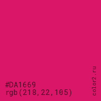 Цвет #DA1669 в цветовой модели RGB обозначается тремя октетами (218, 22, 105) в десятичном формате и #DA1669 в шестнадцатиричном (hex) формате, которые являются интенсивностью красного 218 (hex DA), интенсивность зелёного 22 (hex 16) и интенсивность синего 105 (hex 69).