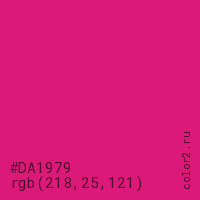 Цвет #DA1979 в цветовой модели RGB обозначается тремя октетами (218, 25, 121) в десятичном формате и #DA1979 в шестнадцатиричном (hex) формате, которые являются интенсивностью красного 218 (hex DA), интенсивность зелёного 25 (hex 19) и интенсивность синего 121 (hex 79).