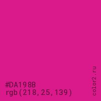 Цвет #DA198B в цветовой модели RGB обозначается тремя октетами (218, 25, 139) в десятичном формате и #DA198B в шестнадцатиричном (hex) формате, которые являются интенсивностью красного 218 (hex DA), интенсивность зелёного 25 (hex 19) и интенсивность синего 139 (hex 8B).
