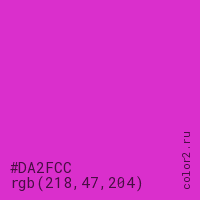 Цвет #DA2FCC в цветовой модели RGB обозначается тремя октетами (218, 47, 204) в десятичном формате и #DA2FCC в шестнадцатиричном (hex) формате, которые являются интенсивностью красного 218 (hex DA), интенсивность зелёного 47 (hex 2F) и интенсивность синего 204 (hex CC).