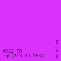 Цвет #DA31FD в цветовой модели RGB обозначается тремя октетами (218, 49, 253) в десятичном формате и #DA31FD в шестнадцатиричном (hex) формате, которые являются интенсивностью красного 218 (hex DA), интенсивность зелёного 49 (hex 31) и интенсивность синего 253 (hex FD).