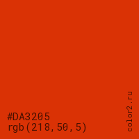 Цвет #DA3205 в цветовой модели RGB обозначается тремя октетами (218, 50, 5) в десятичном формате и #DA3205 в шестнадцатиричном (hex) формате, которые являются интенсивностью красного 218 (hex DA), интенсивность зелёного 50 (hex 32) и интенсивность синего 5 (hex 05).