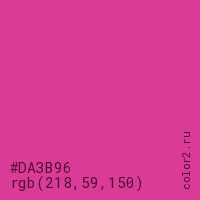 Цвет #DA3B96 в цветовой модели RGB обозначается тремя октетами (218, 59, 150) в десятичном формате и #DA3B96 в шестнадцатиричном (hex) формате, которые являются интенсивностью красного 218 (hex DA), интенсивность зелёного 59 (hex 3B) и интенсивность синего 150 (hex 96).