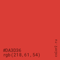Цвет #DA3D36 в цветовой модели RGB обозначается тремя октетами (218, 61, 54) в десятичном формате и #DA3D36 в шестнадцатиричном (hex) формате, которые являются интенсивностью красного 218 (hex DA), интенсивность зелёного 61 (hex 3D) и интенсивность синего 54 (hex 36).