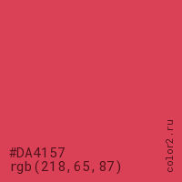 Цвет #DA4157 в цветовой модели RGB обозначается тремя октетами (218, 65, 87) в десятичном формате и #DA4157 в шестнадцатиричном (hex) формате, которые являются интенсивностью красного 218 (hex DA), интенсивность зелёного 65 (hex 41) и интенсивность синего 87 (hex 57).