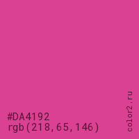 Цвет #DA4192 в цветовой модели RGB обозначается тремя октетами (218, 65, 146) в десятичном формате и #DA4192 в шестнадцатиричном (hex) формате, которые являются интенсивностью красного 218 (hex DA), интенсивность зелёного 65 (hex 41) и интенсивность синего 146 (hex 92).