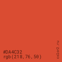 Цвет #DA4C32 в цветовой модели RGB обозначается тремя октетами (218, 76, 50) в десятичном формате и #DA4C32 в шестнадцатиричном (hex) формате, которые являются интенсивностью красного 218 (hex DA), интенсивность зелёного 76 (hex 4C) и интенсивность синего 50 (hex 32).