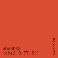 Цвет #DA4D33 в цветовой модели RGB обозначается тремя октетами (218, 77, 51) в десятичном формате и #DA4D33 в шестнадцатиричном (hex) формате, которые являются интенсивностью красного 218 (hex DA), интенсивность зелёного 77 (hex 4D) и интенсивность синего 51 (hex 33).