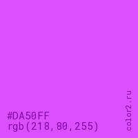 Цвет #DA50FF в цветовой модели RGB обозначается тремя октетами (218, 80, 255) в десятичном формате и #DA50FF в шестнадцатиричном (hex) формате, которые являются интенсивностью красного 218 (hex DA), интенсивность зелёного 80 (hex 50) и интенсивность синего 255 (hex FF).